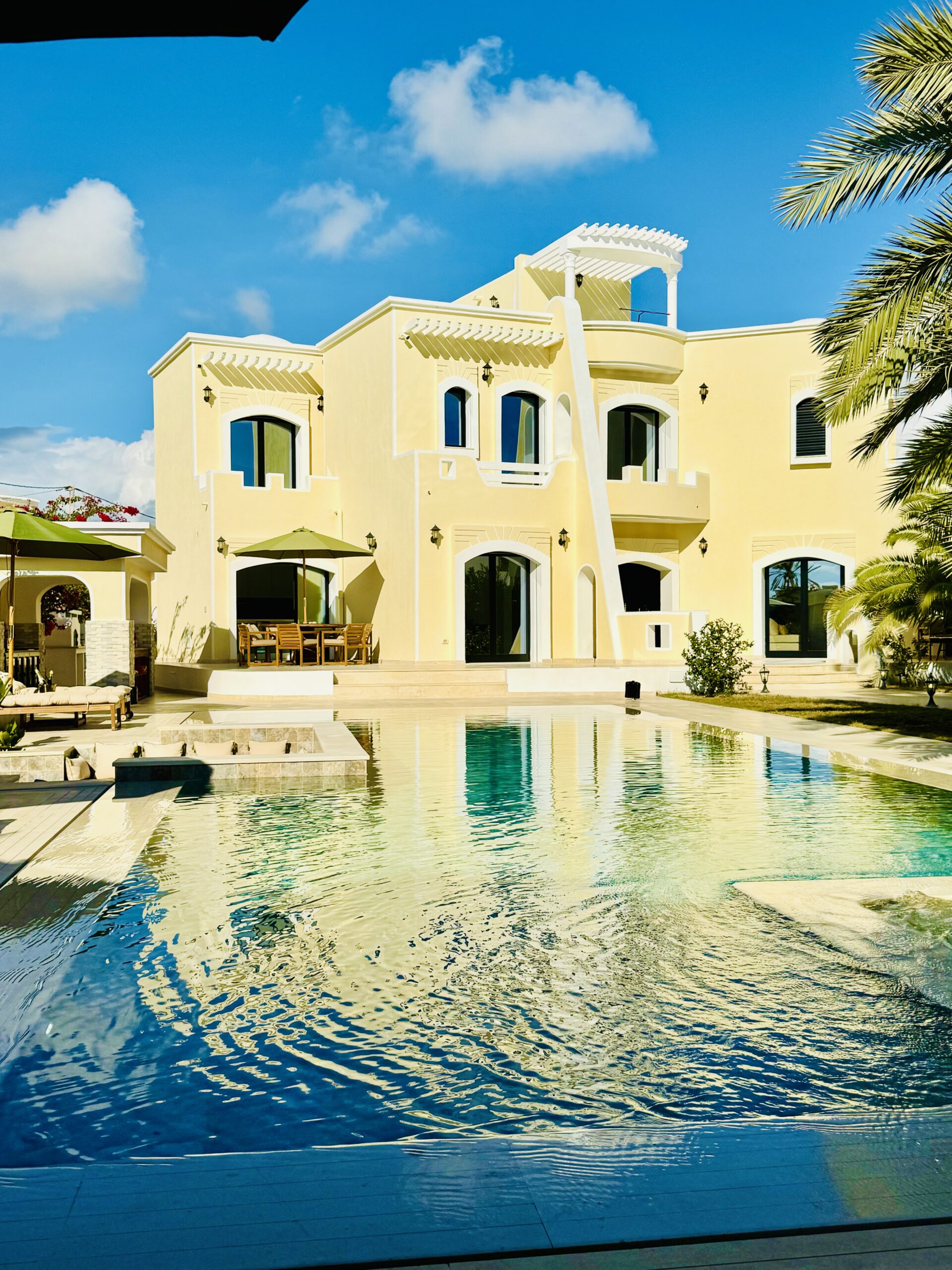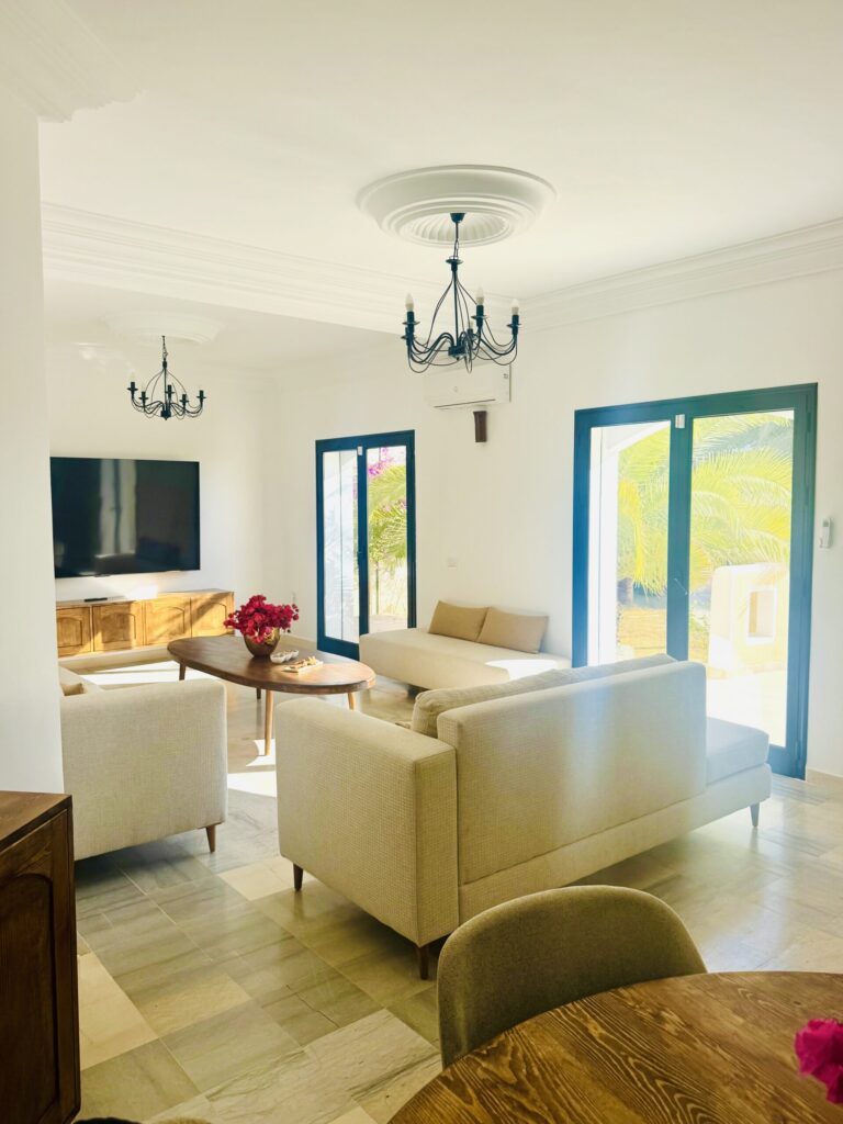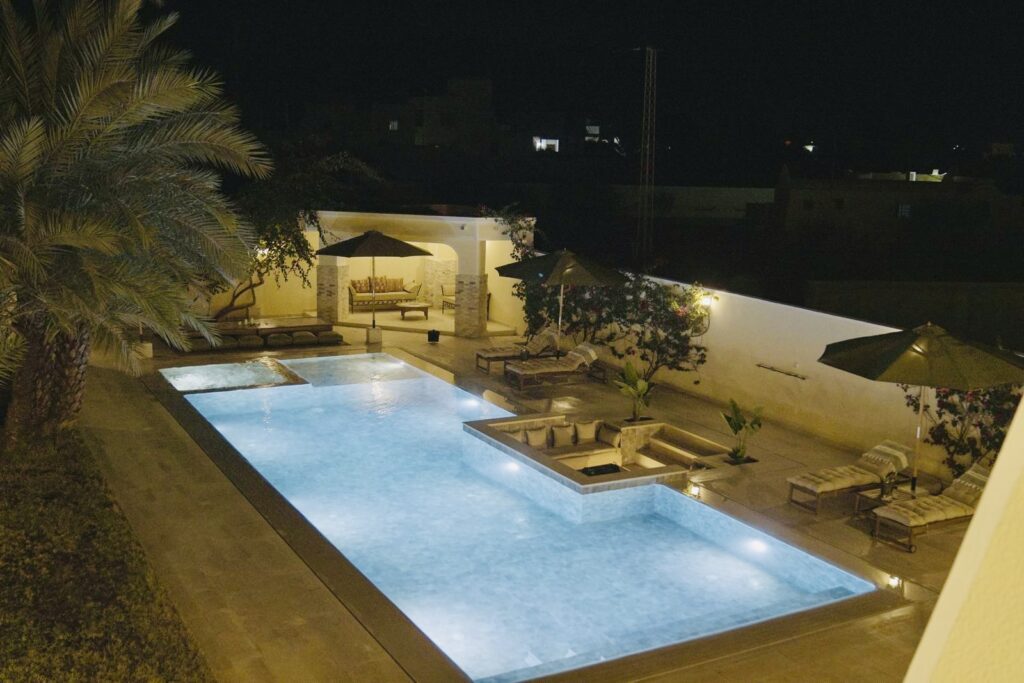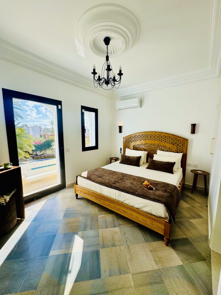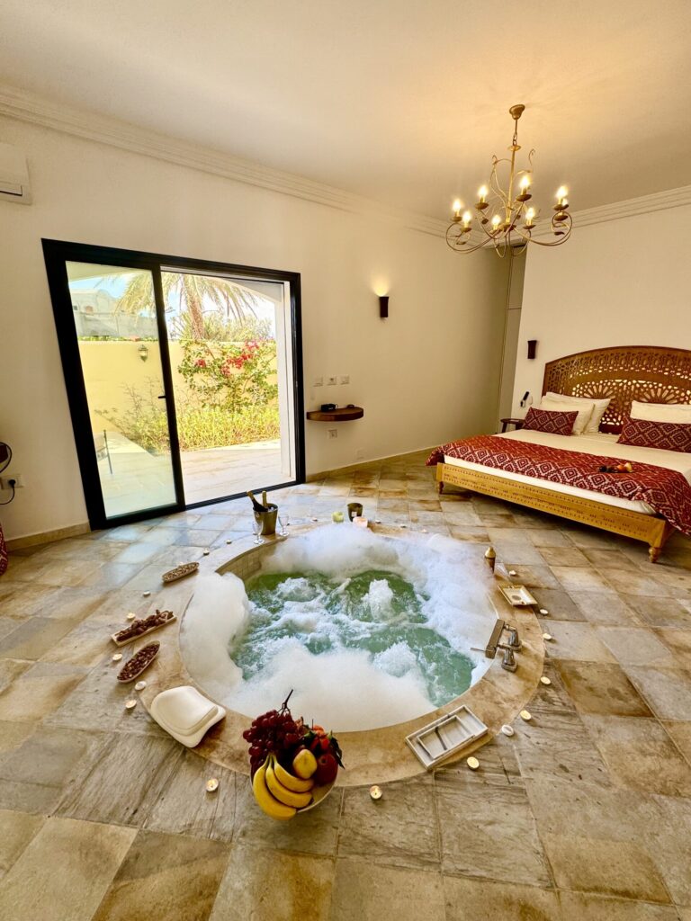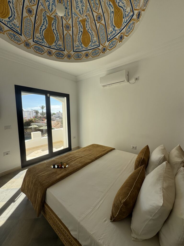 À l’extérieur, terrasses aménagées, cuisine extérieure , barbecue , crêpière , et transats premium vous attendent pour savourer le soleil djerbien. Le service 5 étoiles est à la hauteur de ce cadre d’exception : mini-bar premium, room service 24h/7j, et une multitude d’attentions personnalisées.