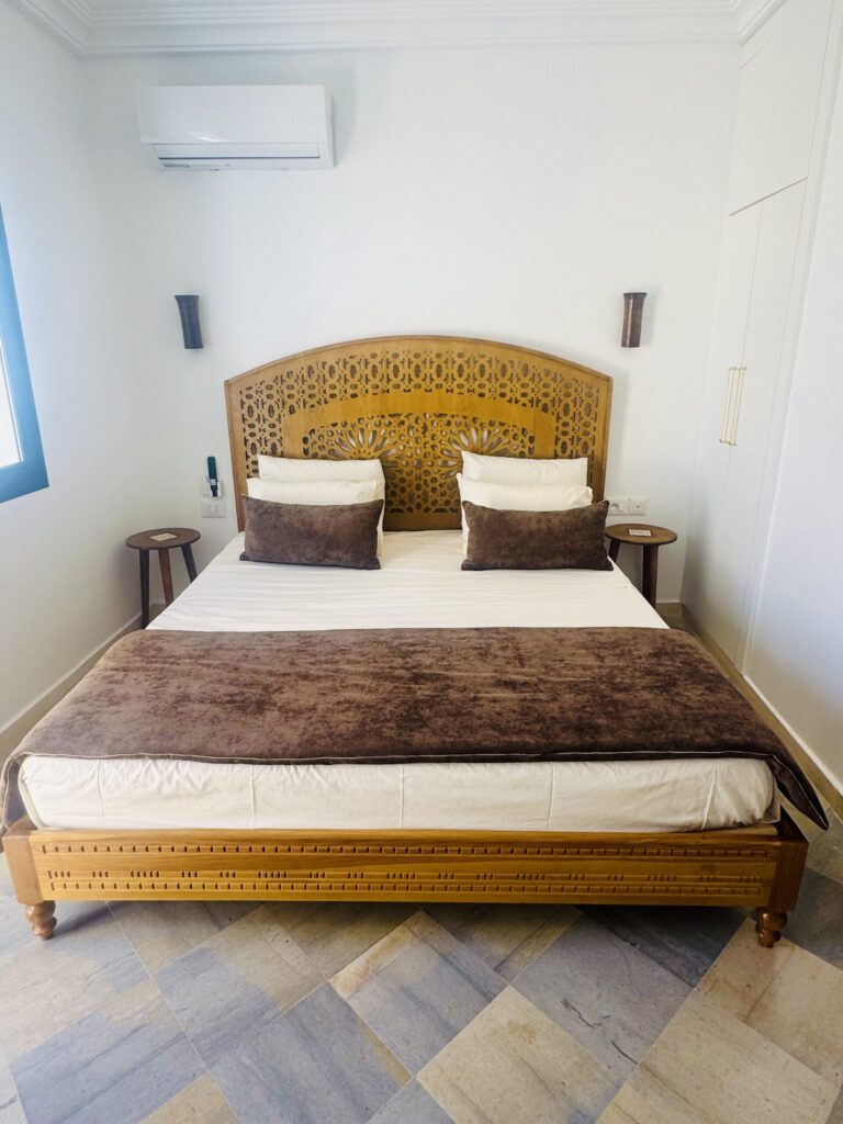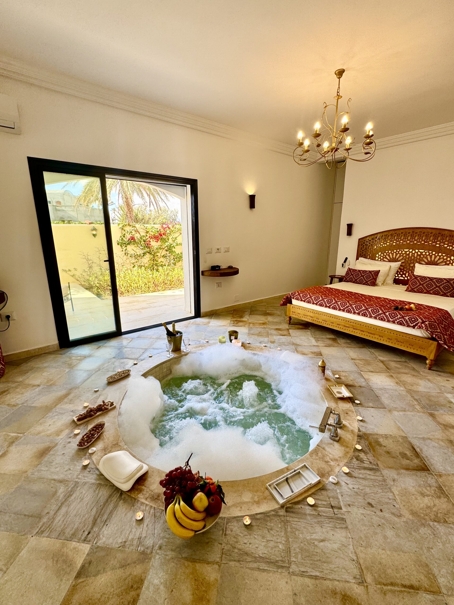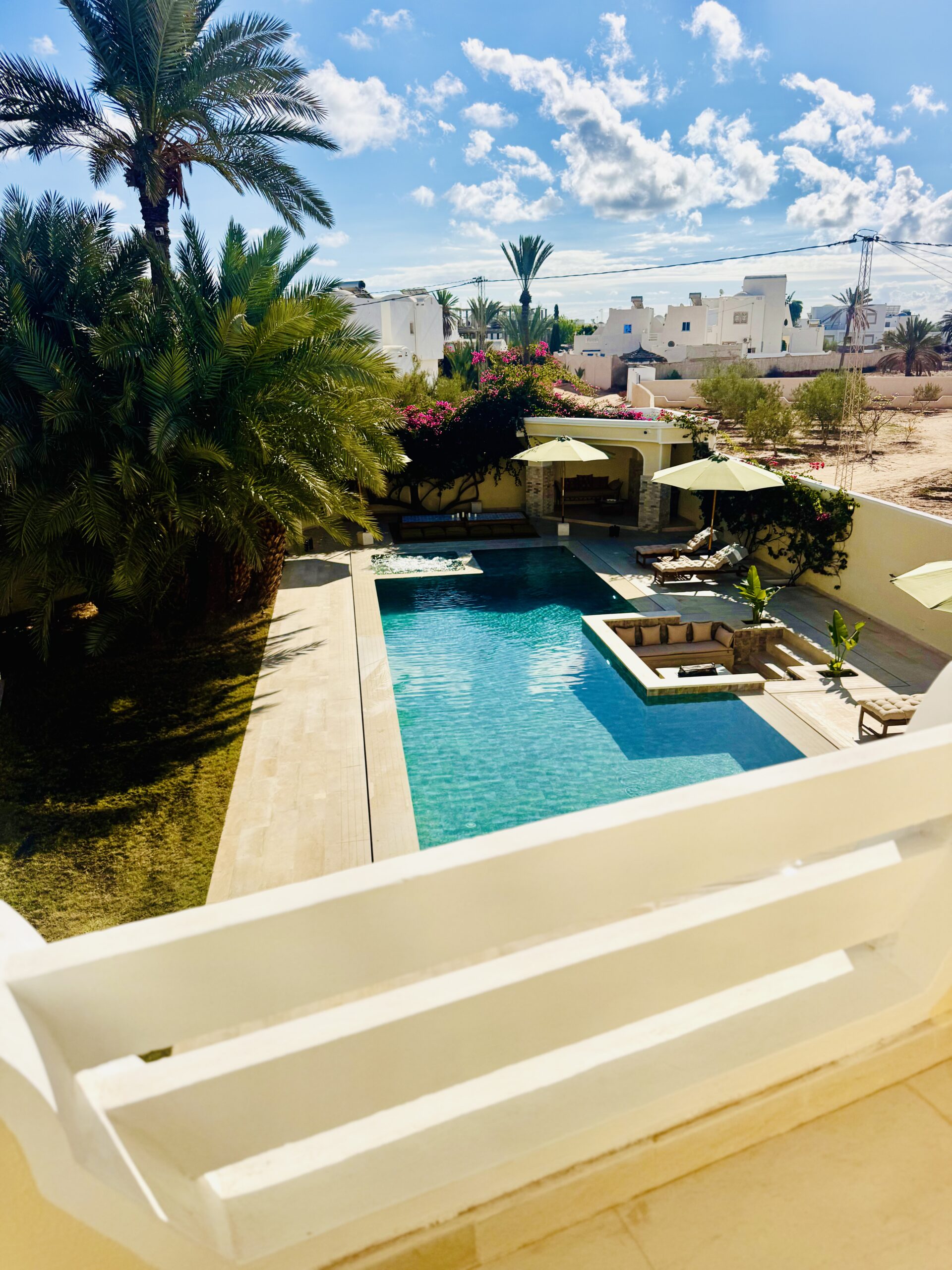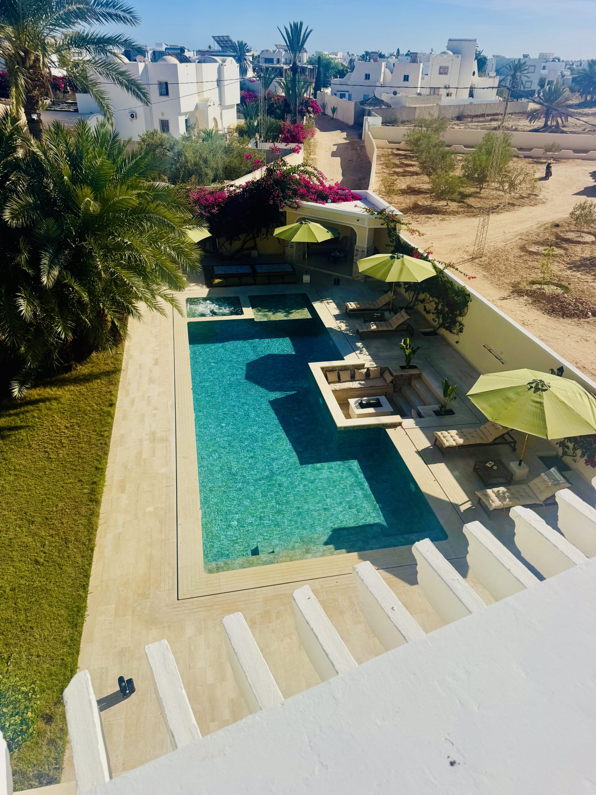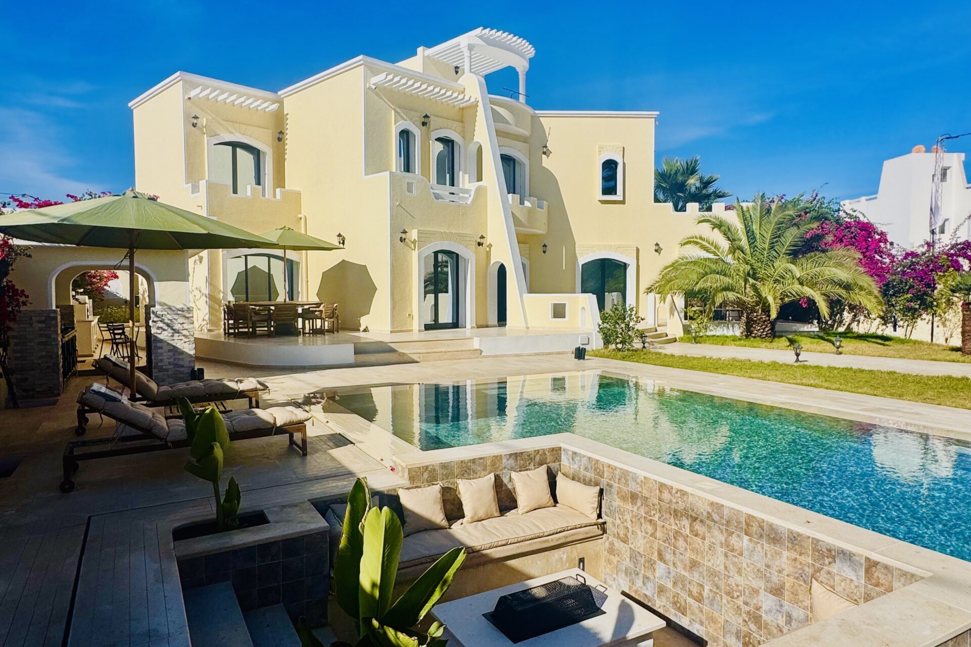 À l’extérieur, terrasses aménagées, cuisine extérieure , barbecue , crêpière , et transats premium vous attendent pour savourer le soleil djerbien. Le service 5 étoiles est à la hauteur de ce cadre d’exception : mini-bar premium, room service 24h/7j, et une multitude d’attentions personnalisées.