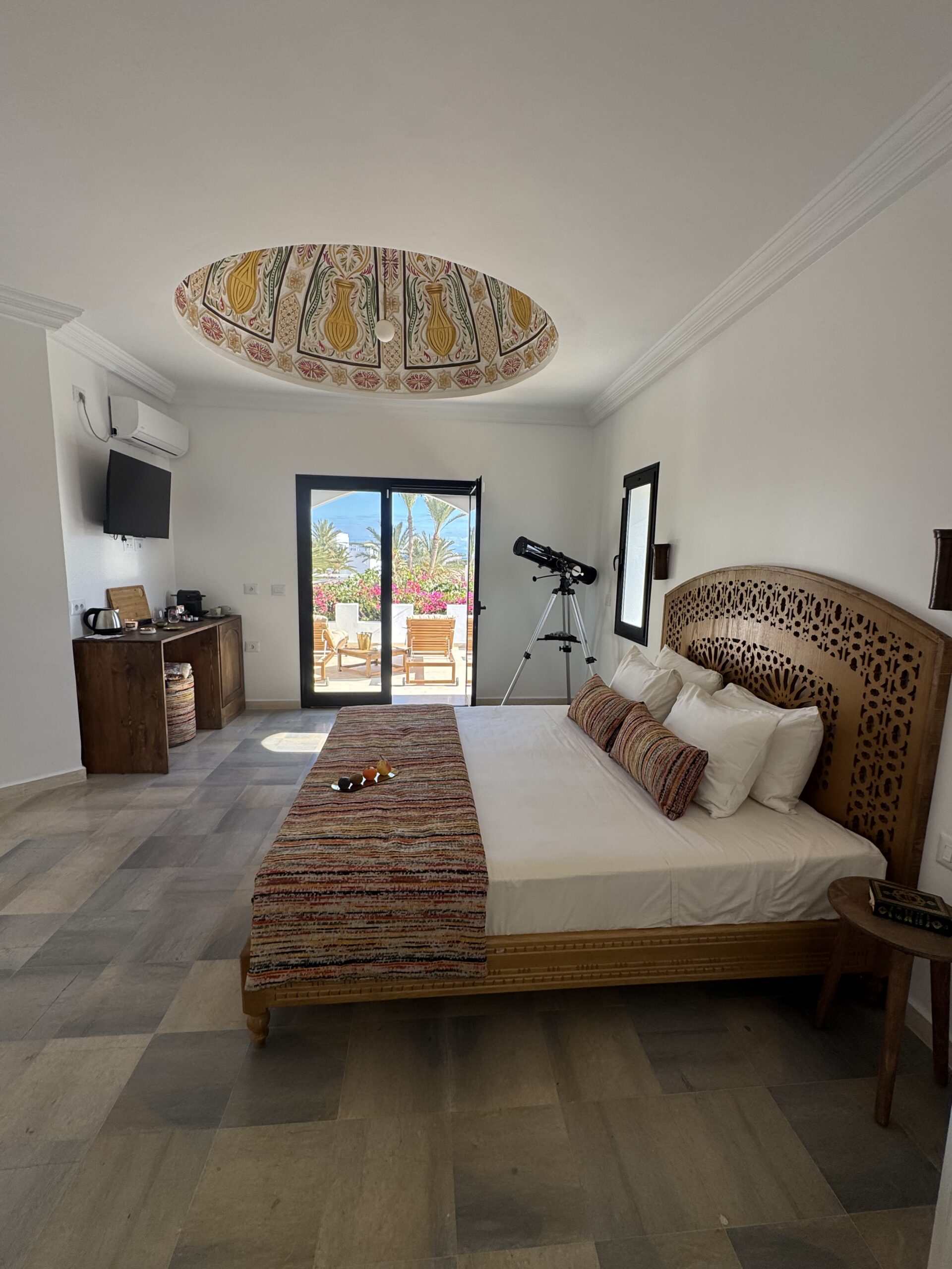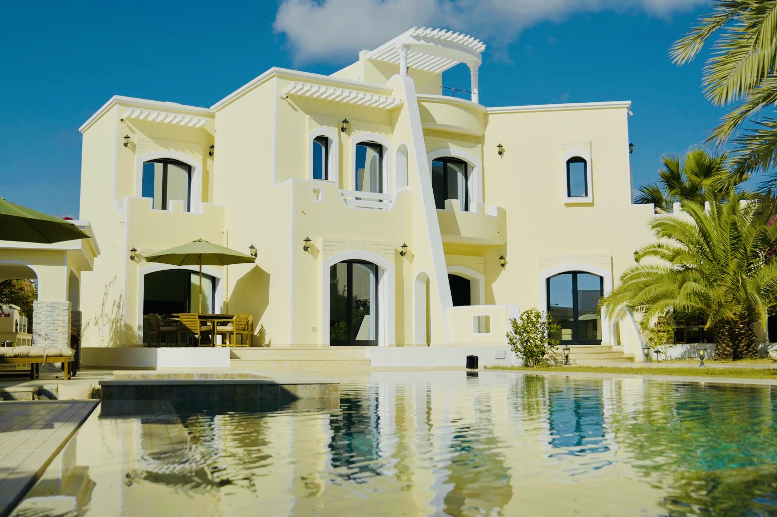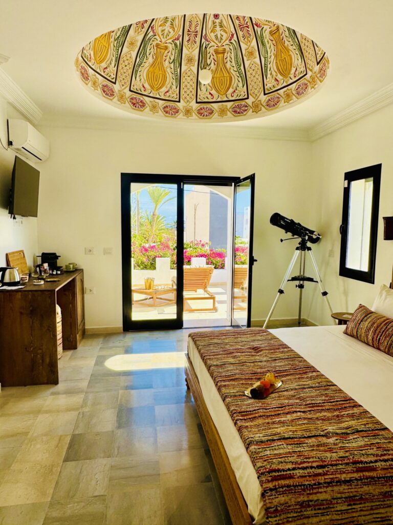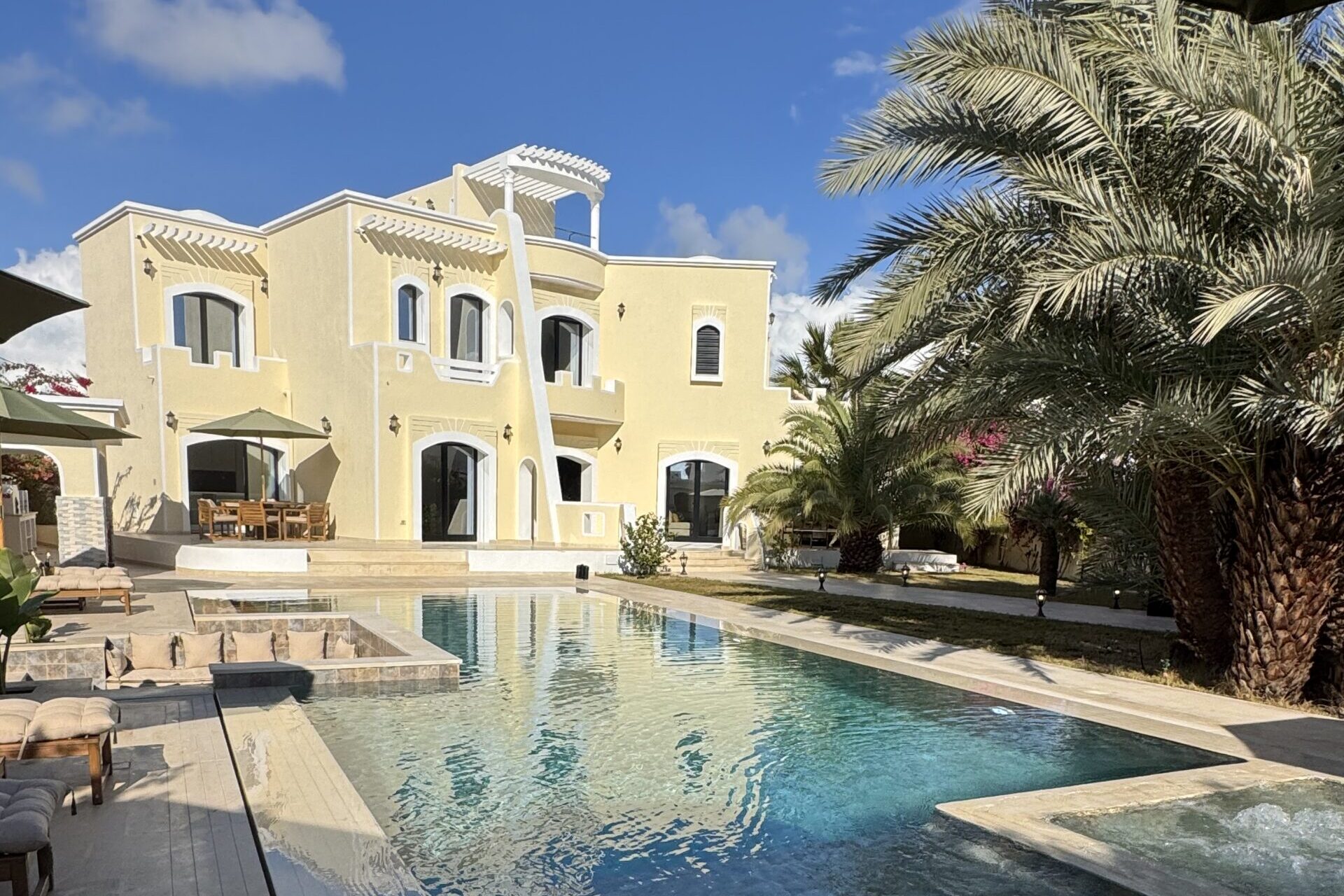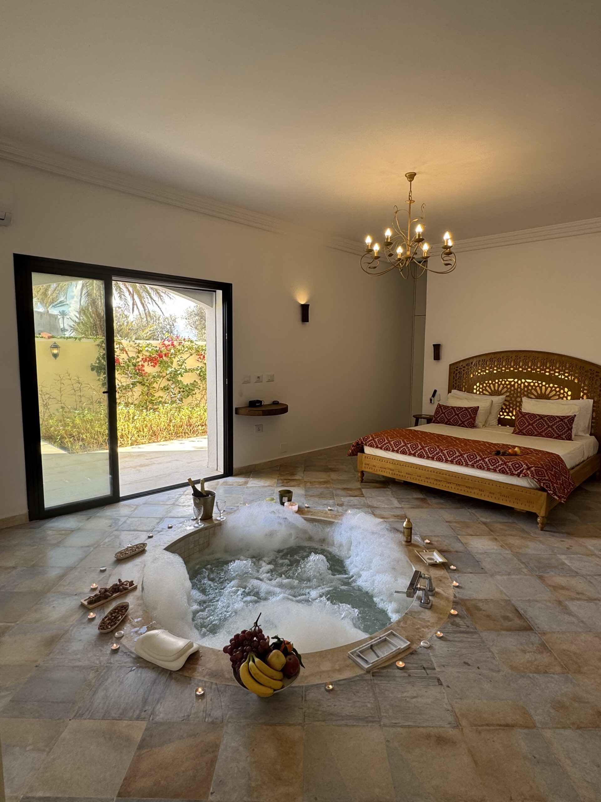 À l’extérieur, terrasses aménagées, cuisine extérieure , barbecue , crêpière , et transats premium vous attendent pour savourer le soleil djerbien. Le service 5 étoiles est à la hauteur de ce cadre d’exception : mini-bar premium, room service 24h/7j, et une multitude d’attentions personnalisées.