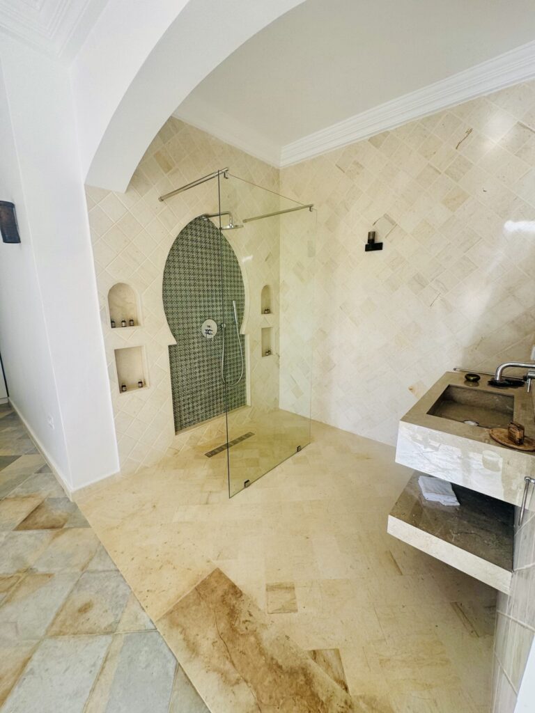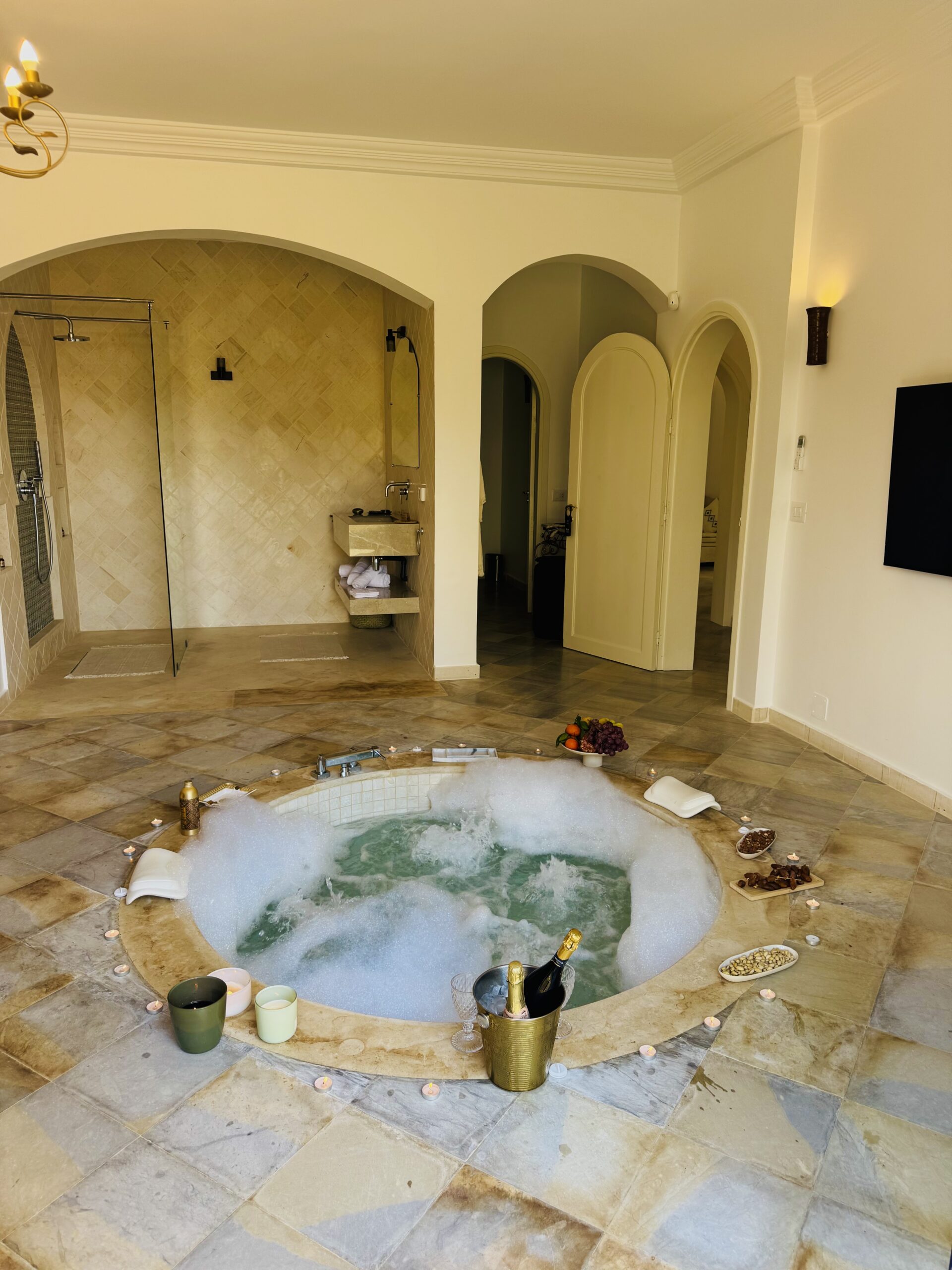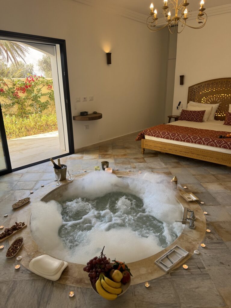 Découvrez ces salles de bain somptueuses avec douches à effet pluie et, dans une des suites, le luxe ultime d’un jacuzzi intégré à la chambre. J’adore !