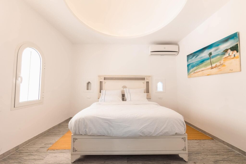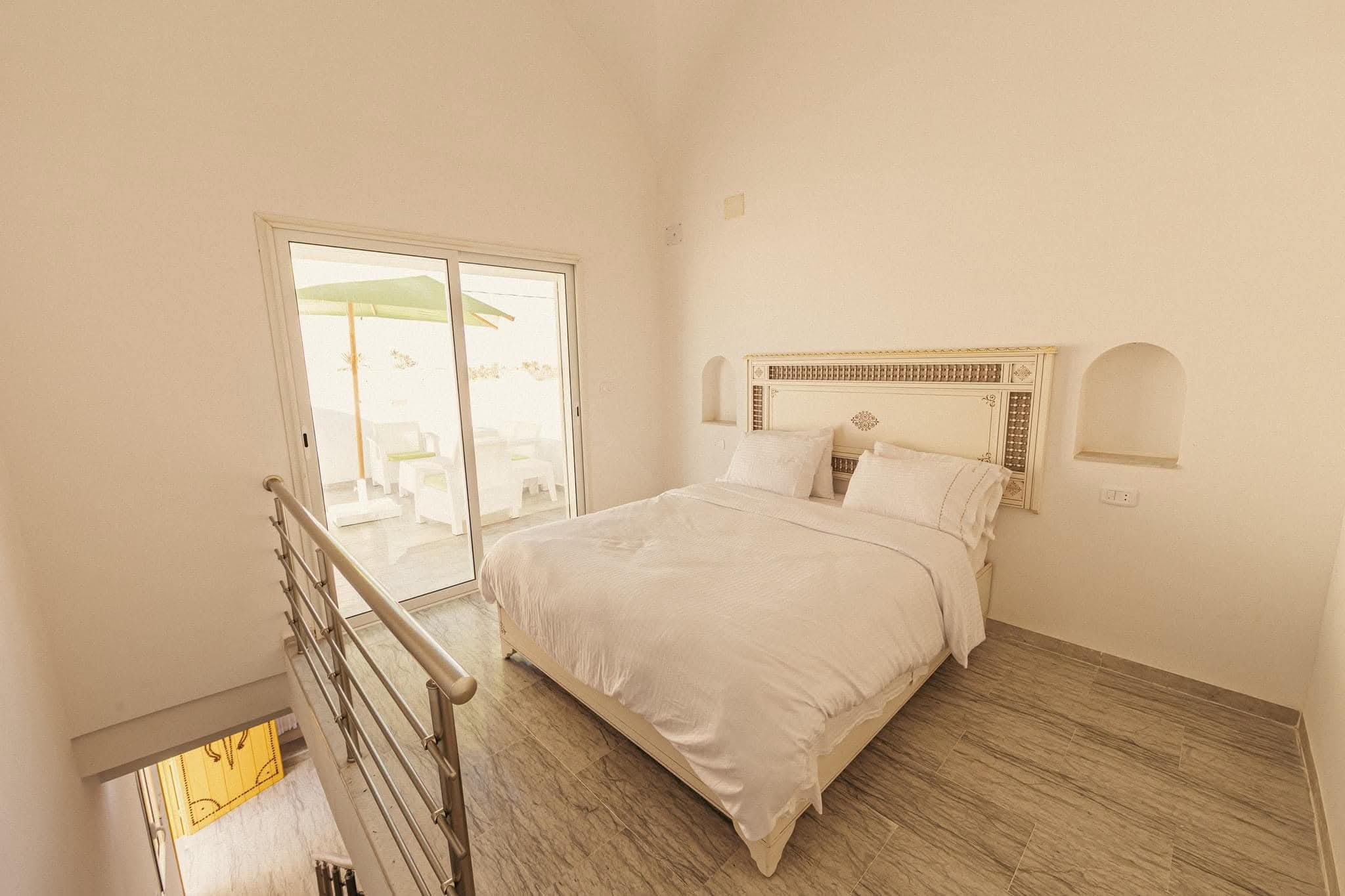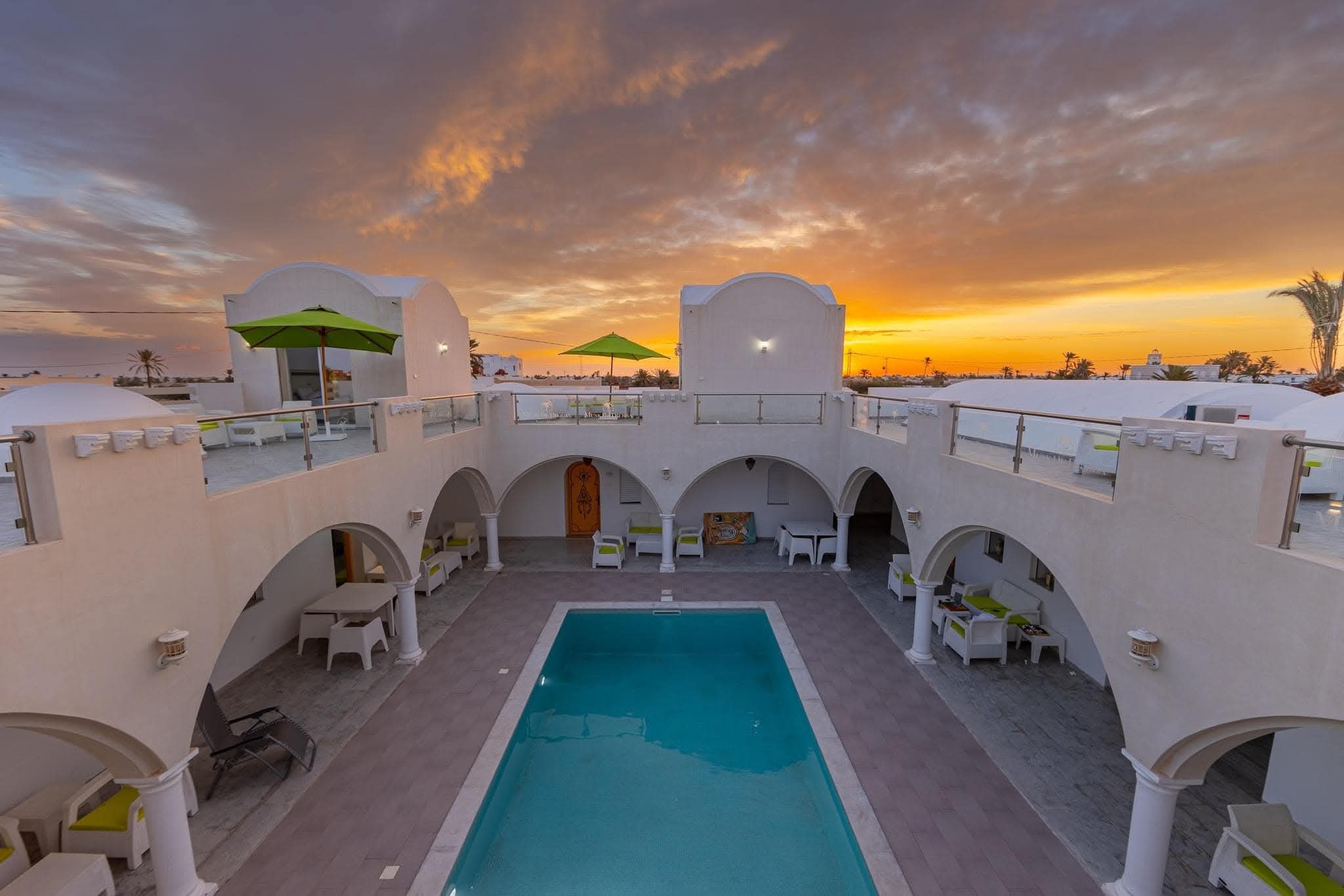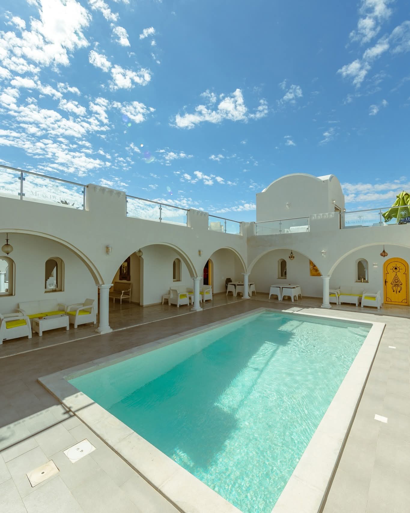 Musk de Djerba allie le charme authentique de Djerba à des prestations modernes. L’établissement comprend 5 suites duplex (chaque suite dispose de 2 lits doubles — capacité 4 personnes par suite, soit 20 personnes au total), toutes climatisées et équipées de salles de bains privées. Chaque suite est aménagée sur deux niveaux offrant intimité et confort. Le cœur de la maison est un patio central avec piscine entourée d’arcades blanches, complété par un rooftop idéal pour les couchers de soleil et les moments conviviaux.