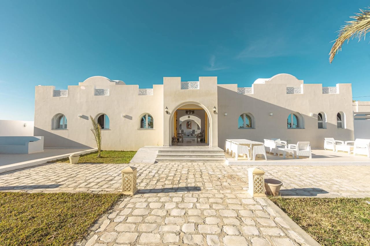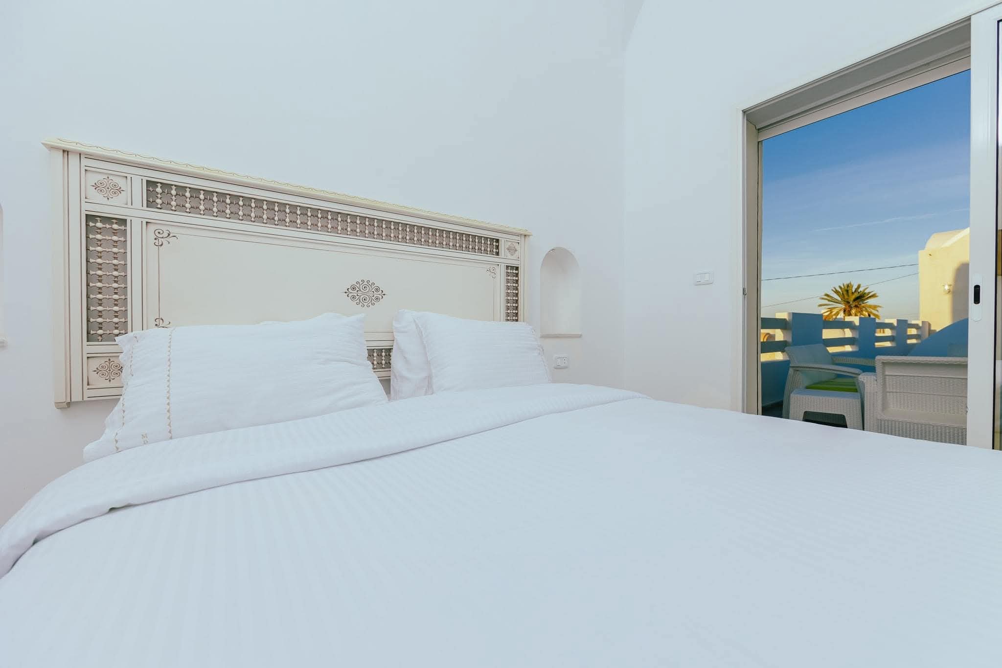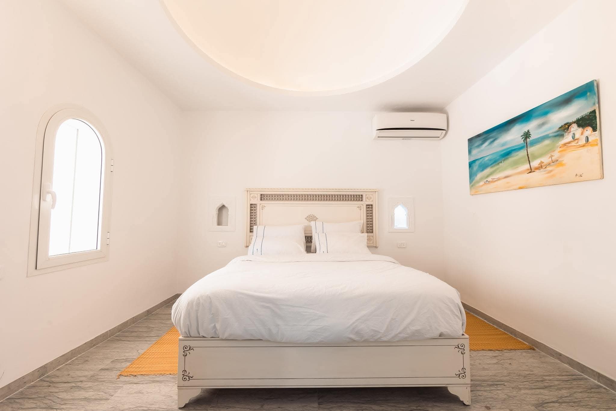 •Décor authentique djérbien : voûtes blanches, arcades, menuiseries locales et finitions contemporaines.