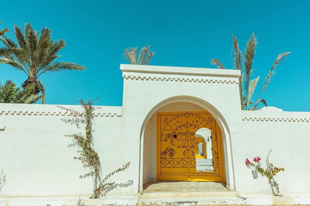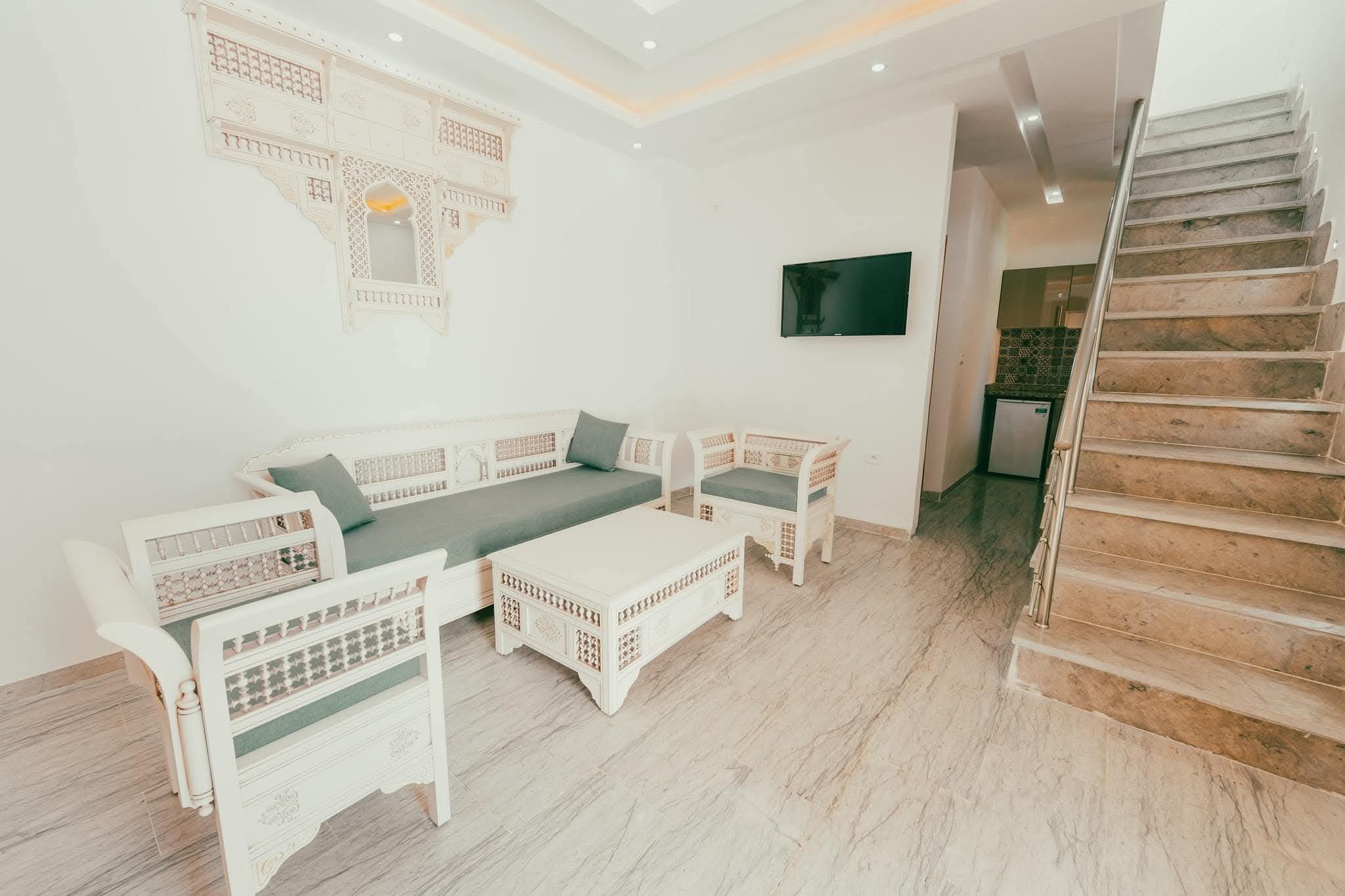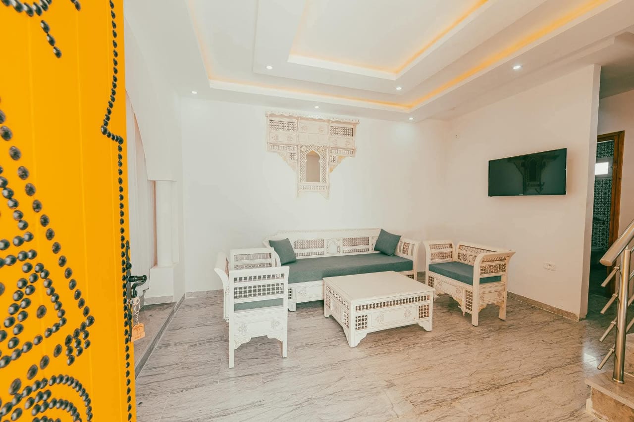 •Décor authentique djérbien : voûtes blanches, arcades, menuiseries locales et finitions contemporaines.